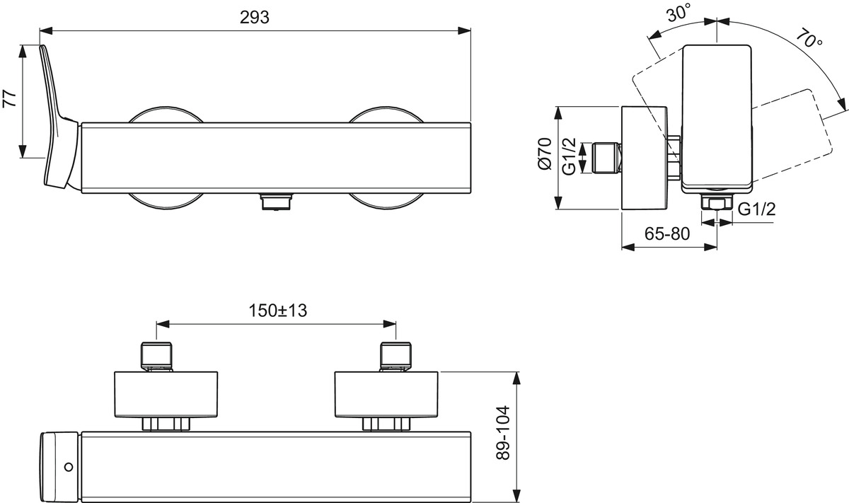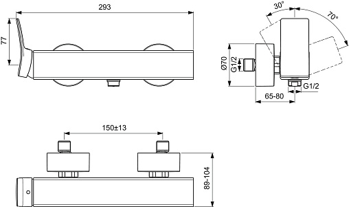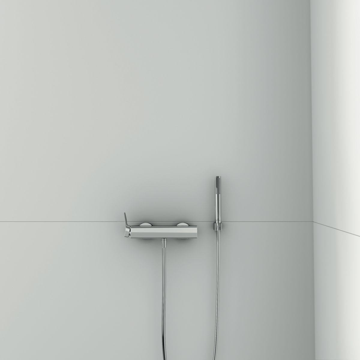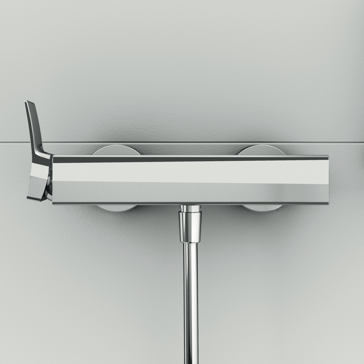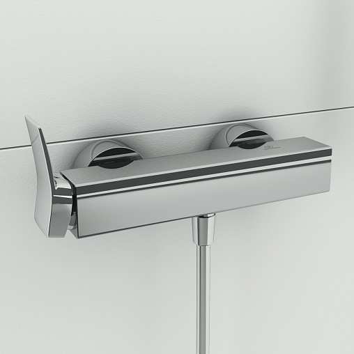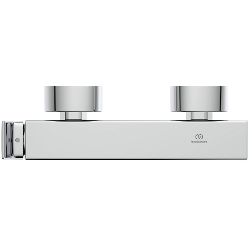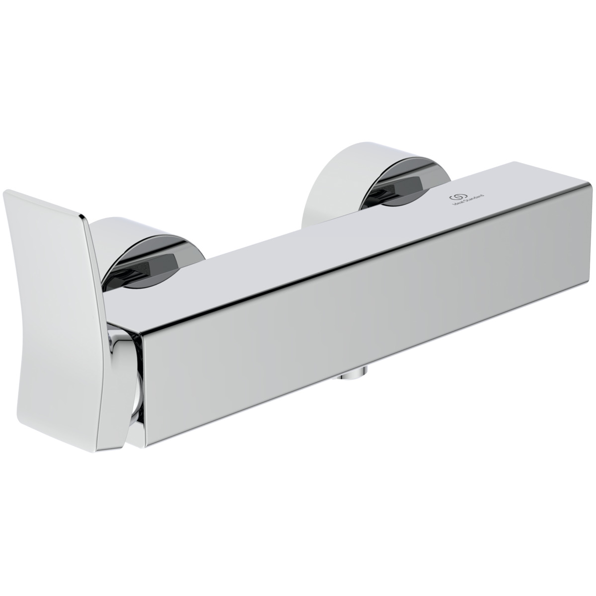 CONCA Настенный смеситель для душа, керамический картридж FirmaFlow 38 мм, с функцией HWTC (ограничение максимальной температуры горячей воды), без функции CLICK, логотип Ideal Standard на корпусе, металлическая рукоятка без индикаторов горячей/холодной воды, обратный клапан, эксцентрики с шумопонижателем