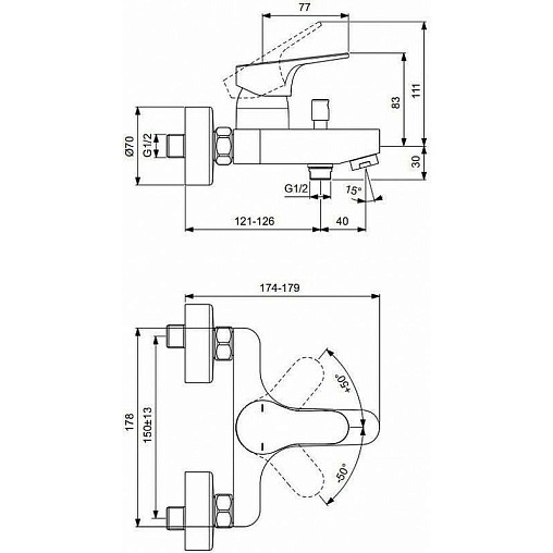 Cerabase, настенный смеситель, неповоротный излив, с выходом на душ (без лейки), арт. BC843AA, Ideal Standard