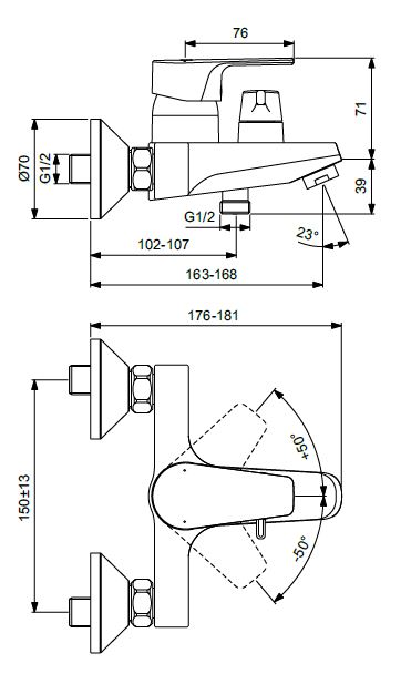 Cerafine D, настенный смеситель, неповоротный излив, с выходом на душ (без лейки), арт. BC494AA, Ideal Standard