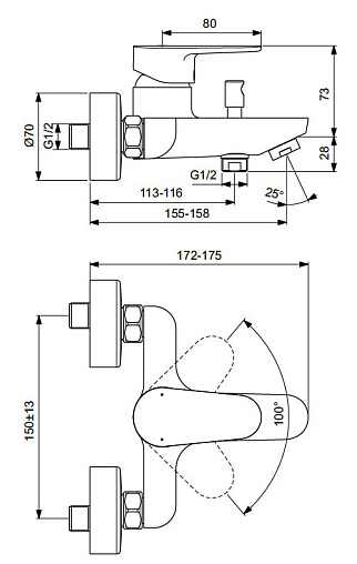 Cerafine О, настенный смеситель, неповоротный излив, с выходом на душ (без лейки), арт. BC500AA, Ideal Standard