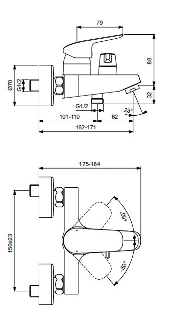 Ceraflex, настенный смеситель, неповоротный излив, с выходом на душ (без лейки), аэратор perlator, арт. B1740AA, Ideal Standard