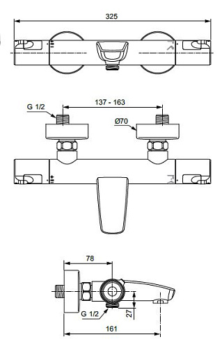 Ceratherm, настенный смеситель, неповоротный излив, с выходом на душ (без лейки), термостат, аэратор perlator, арт. A7223AA, Ideal Standard