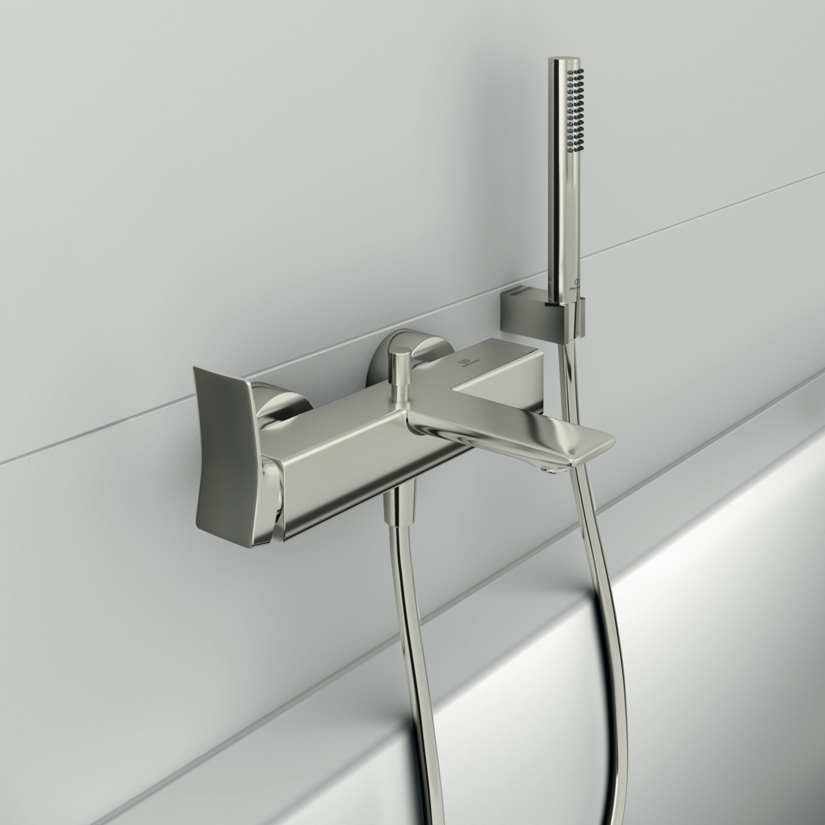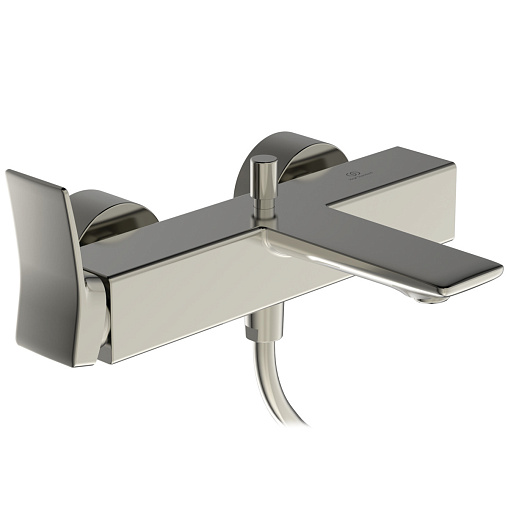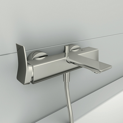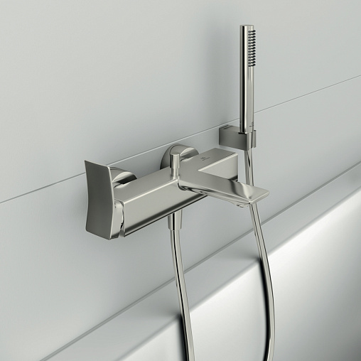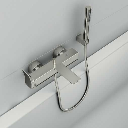 CONCA Настенный смеситель для ванны/душа с душевым комплектом, керамический картридж FirmaFlow 38 мм, с функцией HWTC (ограничение максимальной температуры горячей воды), без функции CLICK, логотип Ideal Standard на корпусе, металлическая рукоятка без индикаторов горячей/холодной воды, обратный клапан, эксцентрики с шумопонижателем, аэратор Coin slot M24x1, автоматическое переключение. Душевой комплект: металлический ручной душ типа Stick с логотипом Ideal Standard, шланг IdealFlex 1600 мм, квадратный держатель для душа. Цветное покрытие - технология PVD