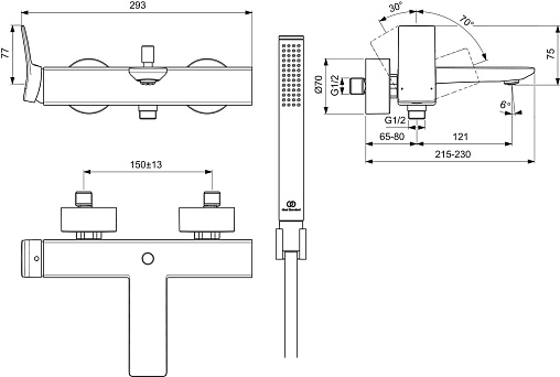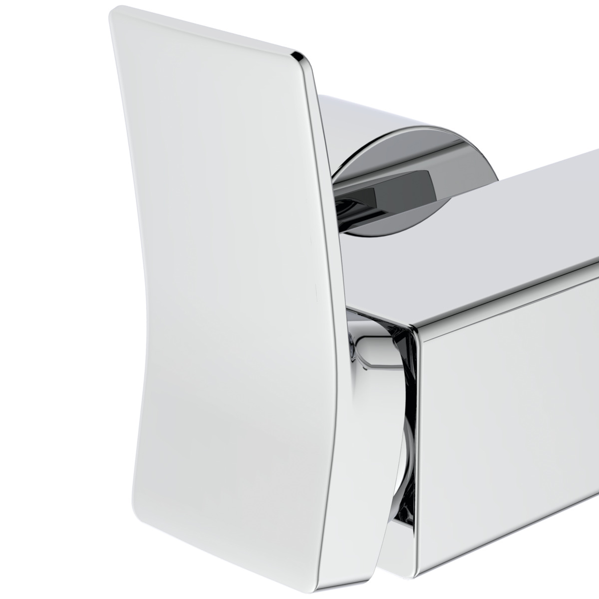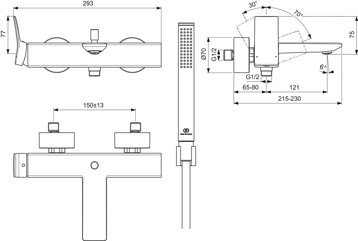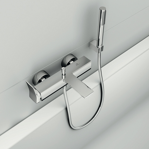 CONCA Настенный смеситель для ванны/душа с душевым комплектом, керамический картридж FirmaFlow 38 мм, с функцией HWTC (ограничение максимальной температуры горячей воды), без функции CLICK, логотип Ideal Standard на корпусе, металлическая рукоятка без индикаторов горячей/холодной воды, обратный клапан, эксцентрики с шумопонижателем, аэратор Coin slot M24x1, автоматическое переключение. Душевой комплект: металлический ручной душ типа Stick с логотипом Ideal Standard, шланг IdealFlex 1600 мм, квадратный держатель для душа