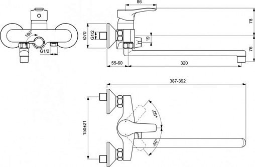 ручное переключение ванна/душ (керамический переключатель), обратный клапан, без душевого гарнитура