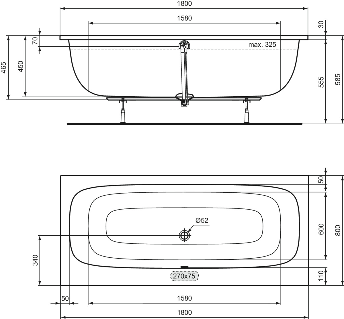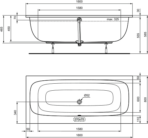 Ideal Standard i.life Duo Прямоугольная ванна 180х80 см для встраиваемой установки или для монтажа с панелями, без отверстий под смеситель, отверстие слива 52 мм, вместимость 325 л, без ножек, без системы слива-перелива