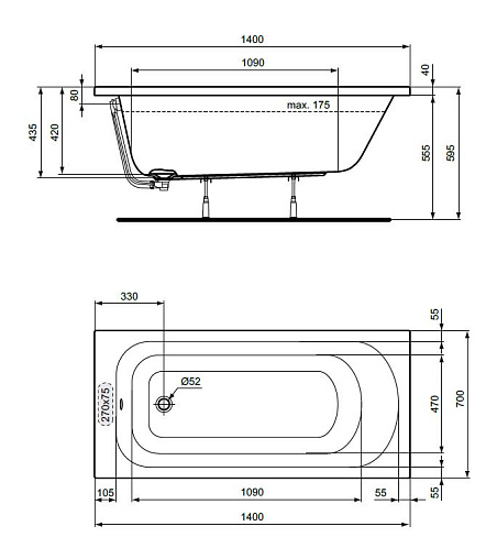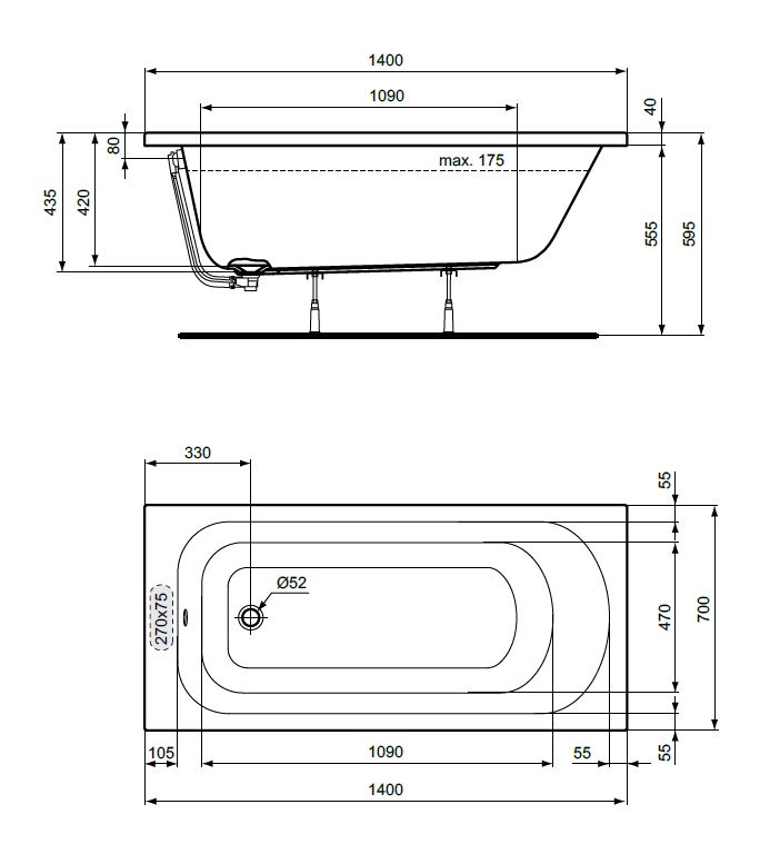 Прямоугольная ванна 150х70х55,5 см для встраивания или для монтажа с панелями, без ножек, без системы слива-перелива, отверстие слива 52 мм, вместимость 175 л.