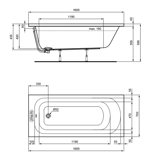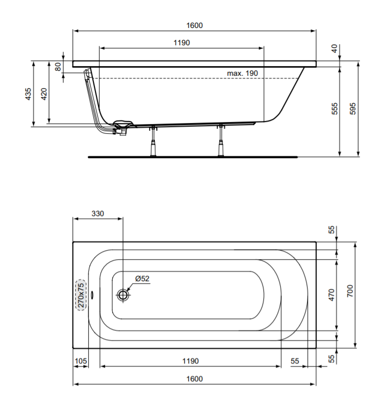 Без ножек, без системы слива-перелива, отверстие слива 52 мм, вместимость 191 л