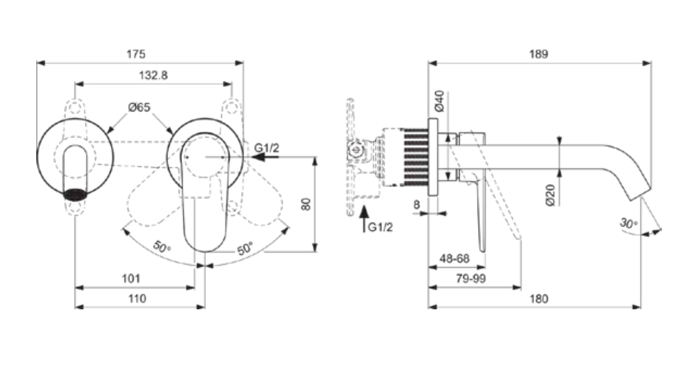 CERAFINE O NUOVO Настенный смеситель для раковины, для монтажа со встраиваемым комплектом A1313NU (заказывается дополнительно), трубчатый излив 180 мм, аэратор 3,8 л/мин, картридж 28 мм FirmaFlow с функцией HWTC, металлическая рукоятка с индикаторами горячей / холодной воды