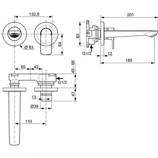 Литой излив 185 мм, аэратор Perlator с ограничением потока 5 л/мин