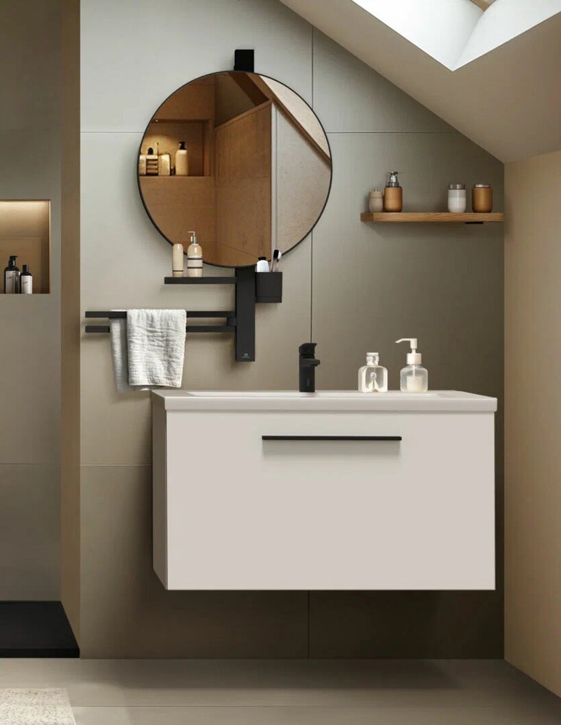 ALU+ Beauty Bar L Комплект аксессуаров, состоящий из: штанги 800 мм с направляющими справа и слева для установки аксессуаров по выбору при первичном монтаже; фиксированного зеркала 500 мм; большой полочки 208 мм (макс. нагрузка 7кг); стаканчика; полотенцедержателя, угол поворота 90°