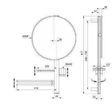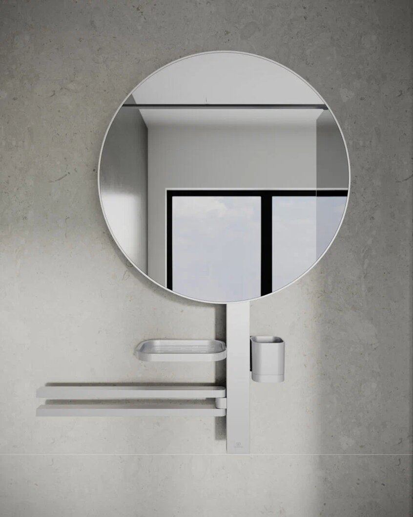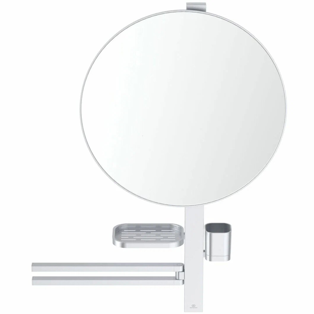 ALU+ Beauty Bar L Комплект аксессуаров, состоящий из: штанги 800 мм с направляющими справа и слева для установки аксессуаров по выбору при первичном монтаже; фиксированного зеркала 500 мм; большой полочки 208 мм (макс. нагрузка 7кг); стаканчика; полотенцедержателя, угол поворота 90°